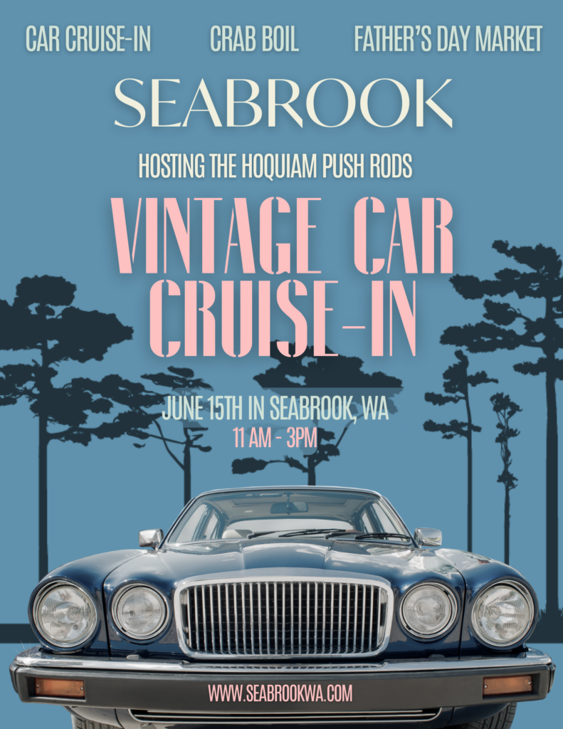 From 11 AM – 3 PM Seabrook will transform into a haven for vintage car enthusiasts with the arrival of our highly anticipated vintage car Cruise-in, sponsored by Push Rods of Hoquiam! Starting at 11 AM and stretching along picturesque Market Street in Seabrook, Washington, this free showcase celebrates the timeless elegance and craftsmanship of classic automobiles. From sleek roadsters to majestic cruisers, attendees will marvel at an impressive array of meticulously restored vehicles from decades past. As the day unfolds, visitors can mingle with fellow aficionados, chat with proud owners, and revel in the nostalgia of bygone eras. Don’t miss this opportunity to step back in time and immerse yourself in the allure of vintage automotive history at the Seabrook Vintage Car Cruise-in!